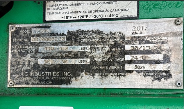 50 ft Max Platform Height, 500 lb Max Weight Capacity, Jib, Power to Platform, 328 hrs